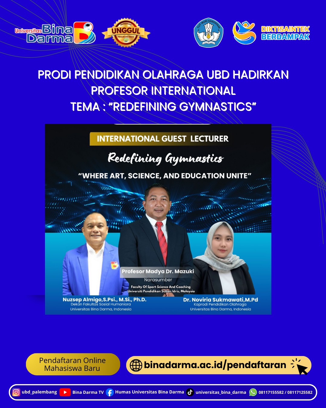 Program Studi Pendidikan Olahraga Universitas Bina Darma sukses menggelar kegiatan Visiting Lecturer dengan tema Adaptive Sport, Inclusive and Innovative Sport World”. Kegiatan ilmiah ini menghadirkan narasumber istimewa, Prof. Shamsul Azhar Shah, Ph.D, seorang profesor epidemiologi dari Faculty of Medicine, Universiti Kebangsaan Malaysia (UKM).